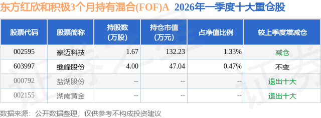 从基金规模来看,东方红欣和积极3个月持有混合(FOF)A基金2026年一季度公布的基金规模为0.33亿元,较上一期规模8042.45万元变化了-4727.8万元,环比变化了-58.79%。该基金最新一期资产配置为:股票占净值比1.8%,债券占净值比5.61%,现金占净值比4.72%。从基金持仓来看,该基金当季前十大股票仓位达1.8%,第一大重仓股为豪迈科技(002595),持仓占比为1.33%。
