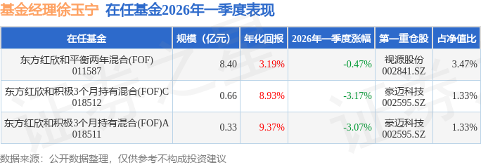 东方红欣和积极3个月持有混合(FOF)A现任基金经理为徐玉宁,本季度增聘基金经理徐玉宁,近期离任的基金经理为邓炯鹏。其中在任基金经理徐玉宁已从业0年又51天,2026年3月3日正式接手管理东方红欣和积极3个月持有混合(FOF)A,任职期间累计回报为2.11%。目前还管理着3只基金产品(包括A类和C类)。