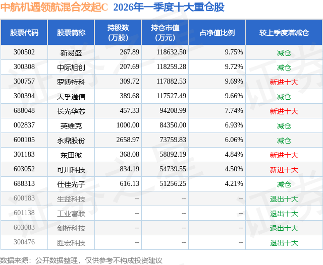 从基金规模来看,中航机遇领航混合发起C基金2026年一季度公布的基金规模为94.68亿元,较上一期规模5.65亿元变化了89.03亿元,环比变化了1575.41%。该基金最新一期资产配置为:股票占净值比92.33%,无债券类资产,现金占净值比7.83%。从基金持仓来看,该基金当季前十大股票仓位达73.1%,第一大重仓股为新易盛(300502),持仓占比为9.75%。