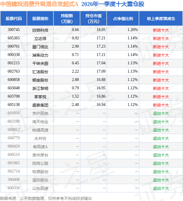 从基金规模来看,中信建投消费升级混合发起式A基金2026年一季度公布的基金规模为0.09亿元,较上一期规模1011.1万元变化了-123.51万元,环比变化了-12.22%。该基金最新一期资产配置为:股票占净值比85.72%,无债券类资产,现金占净值比14.41%。从基金持仓来看,该基金当季前十大股票仓位达11.36%,第一大重仓股为欣锐科技(300745),持仓占比为1.2%。