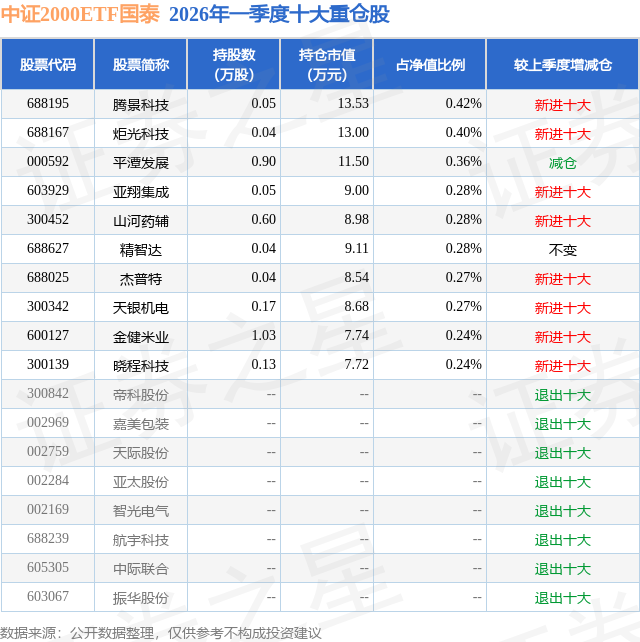 证券之星消息,日前中证2000ETF国泰基金公布一季报,2026年一季度最新规模0.32亿元,季度净值涨幅为2.8%。
