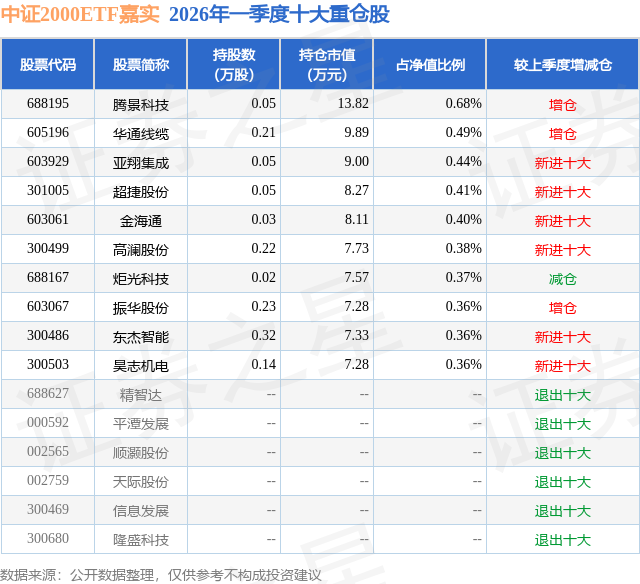 从基金规模来看,中证2000ETF嘉实基金2026年一季度公布的基金规模为0.2亿元,较上一期规模1572.18万元变化了451.23万元,环比变化了28.7%。该基金最新一期资产配置为:股票占净值比97.84%,债券占净值比0.02%,现金占净值比2.12%。从基金持仓来看,该基金当季前十大股票仓位达4.25%,第一大重仓股为腾景科技(688195),持仓占比为0.68%。