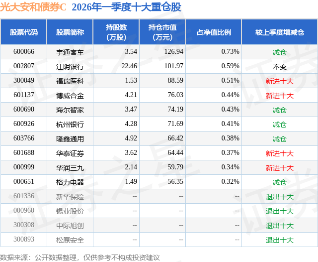从基金规模来看,光大安和债券C基金2026年一季度公布的基金规模为0.61亿元,较上一期规模7274.51万元变化了-1166.5万元,环比变化了-16.04%。该基金最新一期资产配置为:股票占净值比6.85%,债券占净值比117.56%,现金占净值比1.17%。从基金持仓来看,该基金当季前十大股票仓位达4.52%,第一大重仓股为宇通客车(600066),持仓占比为0.73%。
