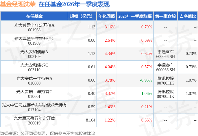 证券之星消息,日前光大安和债券C基金公布一季报,2026年一季度最新规模0.61亿元,季度净值涨幅为0.57%。