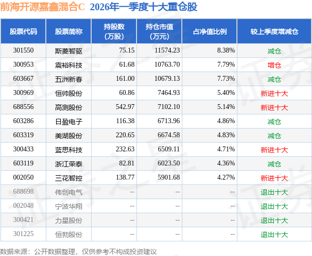 从基金规模来看,前海开源嘉鑫混合C基金2026年一季度公布的基金规模为12.22亿元,较上一期规模3427.53万元变化了11.88亿元,环比变化了3466.49%。该基金最新一期资产配置为:股票占净值比90.42%,无债券类资产,现金占净值比10.28%。从基金持仓来看,该基金当季前十大股票仓位达57.47%,第一大重仓股为斯菱智驱(301550),持仓占比为8.38%。