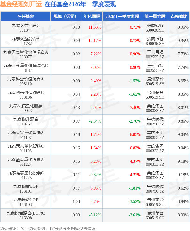 证券之星消息,日前九泰久益混合C基金公布一季报,2026年一季度最新规模0.1亿元,季度净值涨幅为0.73%。
