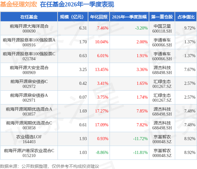 从基金规模来看,前海开源周期优选混合A基金2026年一季度公布的基金规模为1.69亿元,较上一期规模1.63亿元变化了636.28万元,环比变化了3.91%。该基金最新一期资产配置为:股票占净值比88.93%,无债券类资产,现金占净值比7.25%。从基金持仓来看,该基金当季前十大股票仓位达60.92%,第一大重仓股为源杰科技(688498),持仓占比为7.48%。