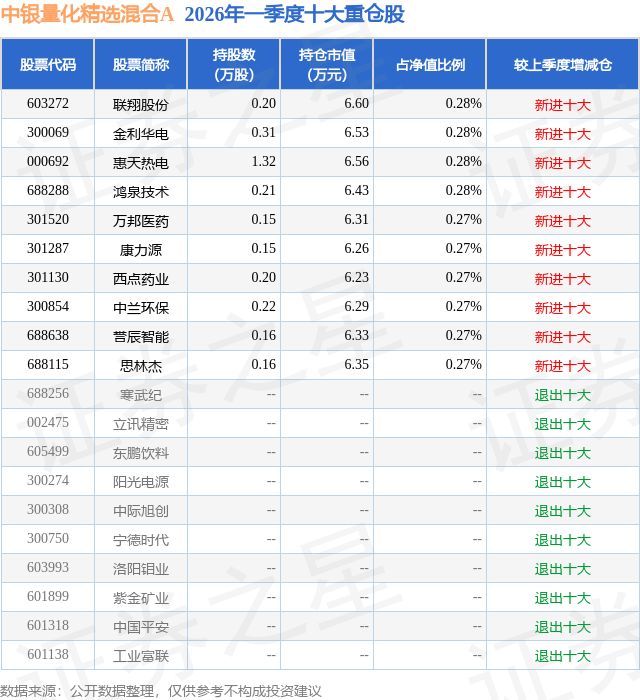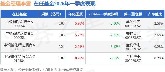证券之星消息,日前中银量化精选混合A基金公布一季报,2026年一季度最新规模0.21亿元,季度净值涨幅为-3.43%。
