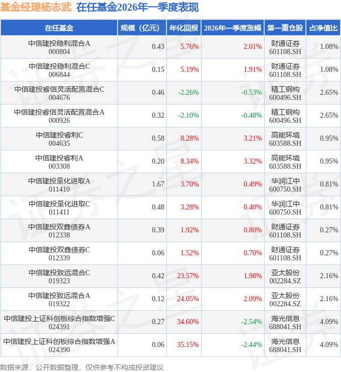 证券之星消息,日前中信建投睿利C基金公布一季报,2026年一季度最新规模0.58亿元,季度净值涨幅为3.21%。