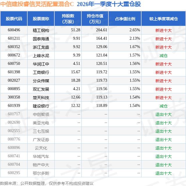 从基金规模来看,中信建投睿信灵活配置混合C基金2026年一季度公布的基金规模为0.46亿元,较上一期规模709.82万元变化了3866.43万元,环比变化了544.71%。该基金最新一期资产配置为:股票占净值比92.98%,无债券类资产,现金占净值比7.15%。从基金持仓来看,该基金当季前十大股票仓位达17.31%,第一大重仓股为精工钢构(600496),持仓占比为2.65%。