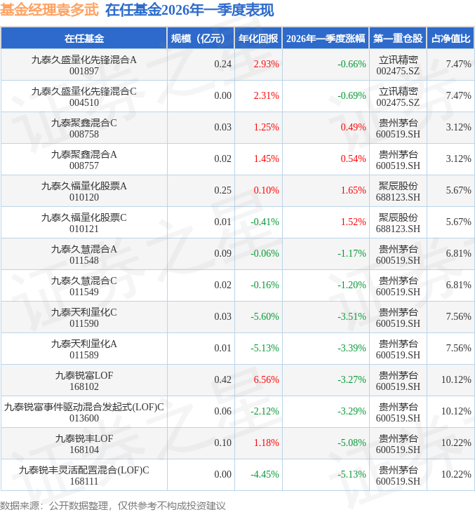 证券之星消息,日前九泰久盛量化先锋混合C基金公布一季报,2026年一季度最新规模0.0亿元,季度净值涨幅为-0.69%。