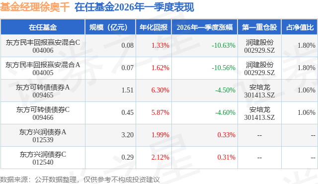 东方民丰回报赢安混合A现任基金经理为徐奥千,本季度增聘基金经理徐奥千,近期离任的基金经理为张博。其中在任基金经理徐奥千已从业4年又110天,2025年11月25日正式接手管理东方民丰回报赢安混合A,任职期间累计回报为8.38%。目前还管理着6只基金产品(包括A类和C类),其中本季度表现最佳的基金为东方兴润债券A(012539),季度净值涨幅为0.33%。