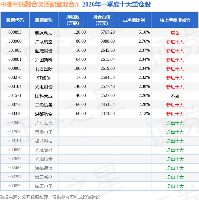 从基金规模来看,中邮军民融合灵活配置混合A基金2026年一季度公布的基金规模为7.11亿元,较上一期规模4.15亿元变化了2.97亿元,环比变化了71.53%。该基金最新一期资产配置为:股票占净值比93.16%,无债券类资产,现金占净值比6.5%。从基金持仓来看,该基金当季前十大股票仓位达26.17%,第一大重仓股为航发动力(600893),持仓占比为5.16%。