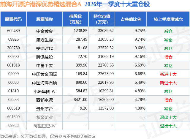 从基金规模来看,前海开源沪港深优势精选混合A基金2026年一季度公布的基金规模为33.78亿元,较上一期规模47.37亿元变化了-13.6亿元,环比变化了-28.71%。该基金最新一期资产配置为:股票占净值比91.44%,无债券类资产,现金占净值比10.03%。从基金持仓来看,该基金当季前十大股票仓位达71.72%,第一大重仓股为中金黄金(600489),持仓占比为9.75%。