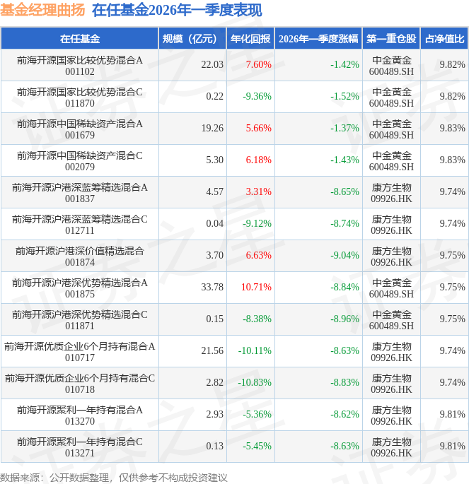 证券之星消息,日前前海开源沪港深优势精选混合A基金公布一季报,2026年一季度最新规模33.78亿元,季度净值涨幅为-8.84%。
