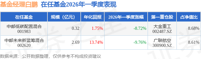 证券之星消息,日前中邮低碳配置混合基金公布一季报,2026年一季度最新规模0.32亿元,季度净值涨幅为-8.72%。