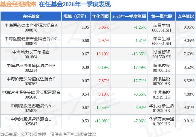 证券之星消息,日前中海魅力长三角混合基金公布一季报,2026年一季度最新规模0.67亿元,季度净值涨幅为-16.35%。