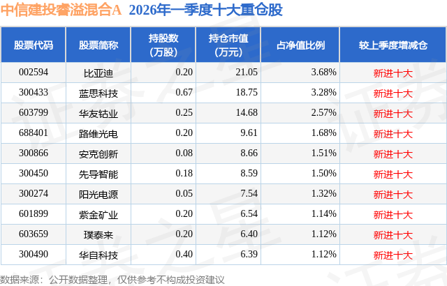 证券之星消息,日前中信建投睿溢混合A基金公布一季报,2026年一季度最新规模0.04亿元,季度净值涨幅为-4.27%。