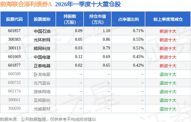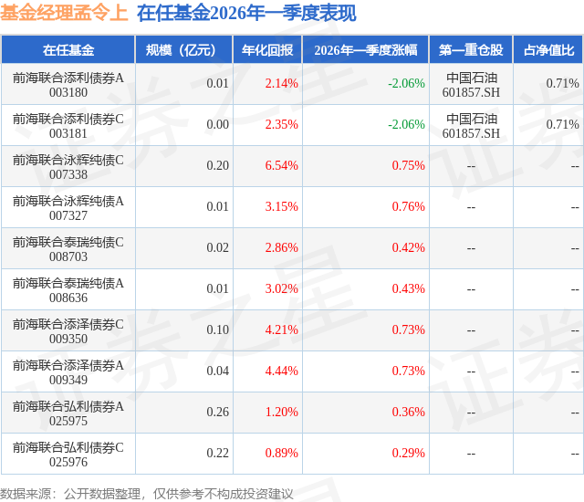 证券之星消息,日前前海联合添利债券A基金公布一季报,2026年一季度最新规模0.01亿元,季度净值涨幅为-2.06%。