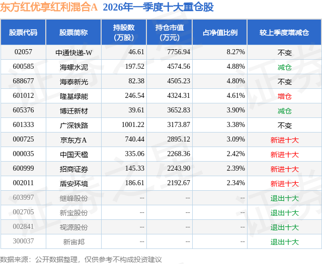 从基金规模来看,东方红优享红利混合A基金2026年一季度公布的基金规模为9.2亿元,较上一期规模11.52亿元变化了-2.32亿元,环比变化了-20.12%。该基金最新一期资产配置为:股票占净值比79.48%,无债券类资产,现金占净值比20.8%。从基金持仓来看,该基金当季前十大股票仓位达40.08%,第一大重仓股为中通快递-W(02057),持仓占比为8.27%。