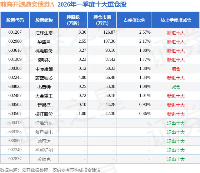 从基金规模来看,前海开源鼎安债券A基金2026年一季度公布的基金规模为0.07亿元,较上一期规模2954.41万元变化了-2245.66万元,环比变化了-76.01%。该基金最新一期资产配置为:股票占净值比14.96%,债券占净值比84.98%,现金占净值比7.86%。从基金持仓来看,该基金当季前十大股票仓位达14.96%,第一大重仓股为汇绿生态(001267),持仓占比为2.57%。