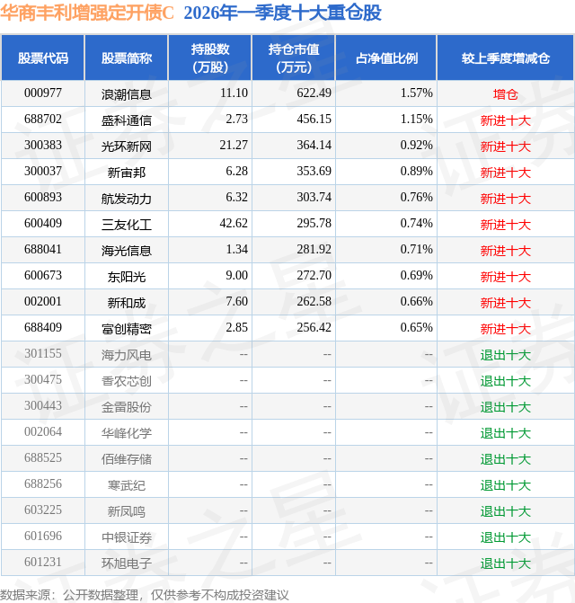 从基金规模来看,华商丰利增强定开债C基金2026年一季度公布的基金规模为0.57亿元,较上一期规模4827.14万元变化了833.2万元,环比变化了17.26%。该基金最新一期资产配置为:股票占净值比21.87%,债券占净值比81.77%,现金占净值比25.9%。从基金持仓来看,该基金当季前十大股票仓位达8.74%,第一大重仓股为浪潮信息(000977),持仓占比为1.57%。