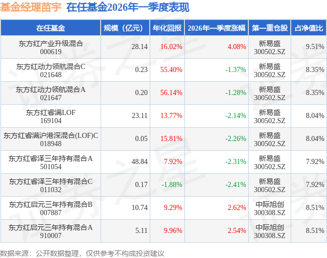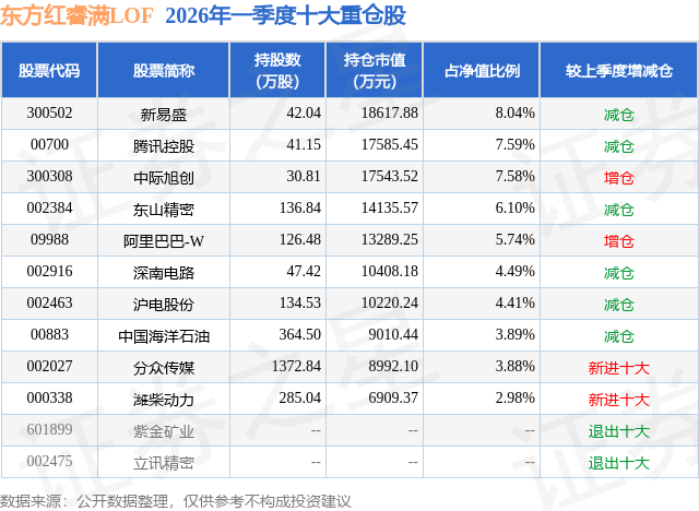 从基金规模来看,东方红睿满LOF基金2026年一季度公布的基金规模为23.11亿元,较上一期规模22.71亿元变化了3971.73万元,环比变化了1.75%。该基金最新一期资产配置为:股票占净值比86.94%,无债券类资产,现金占净值比12.51%。从基金持仓来看,该基金当季前十大股票仓位达54.7%,第一大重仓股为新易盛(300502),持仓占比为8.04%。
