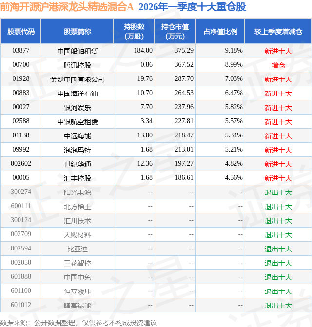 从基金规模来看,前海开源沪港深龙头精选混合A基金2026年一季度公布的基金规模为0.39亿元,较上一期规模5640.84万元变化了-1736.37万元,环比变化了-30.78%。该基金最新一期资产配置为:股票占净值比87.38%,无债券类资产,现金占净值比12.74%。从基金持仓来看,该基金当季前十大股票仓位达62.99%,第一大重仓股为中国船舶租赁(03877),持仓占比为9.18%。