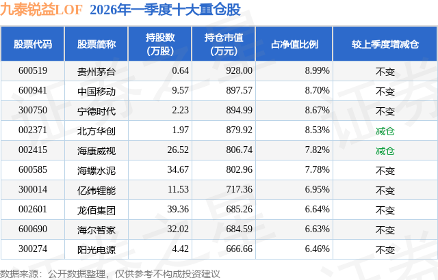 从基金规模来看,九泰锐益LOF基金2026年一季度公布的基金规模为1.03亿元,较上一期规模1.28亿元变化了-2485.51万元,环比变化了-19.41%。该基金最新一期资产配置为:股票占净值比90.8%,无债券类资产,现金占净值比9.77%。从基金持仓来看,该基金当季前十大股票仓位达77.17%,第一大重仓股为贵州茅台(600519),持仓占比为8.99%。