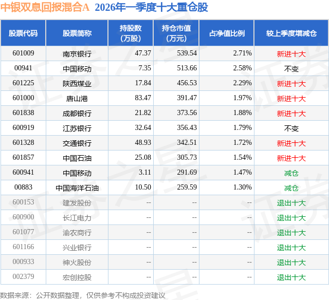 从基金规模来看,中银双息回报混合A基金2026年一季度公布的基金规模为1.99亿元,较上一期规模1.79亿元变化了1931.93万元,环比变化了10.77%。该基金最新一期资产配置为:股票占净值比74.26%,债券占净值比22.87%,现金占净值比2.93%。从基金持仓来看,该基金当季前十大股票仓位达19.25%,第一大重仓股为南京银行(601009),持仓占比为2.71%。