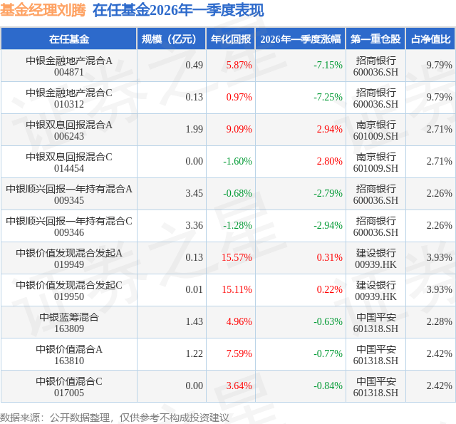 证券之星消息,日前中银双息回报混合A基金公布一季报,2026年一季度最新规模1.99亿元,季度净值涨幅为2.94%。
