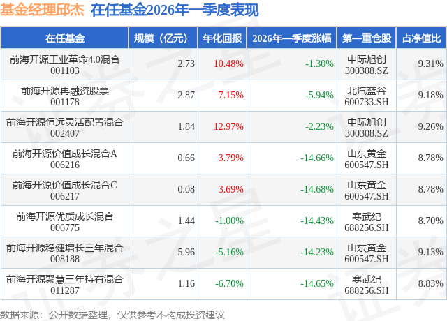 证券之星消息,日前前海开源价值成长混合C基金公布一季报,2026年一季度最新规模0.08亿元,季度净值涨幅为-14.68%。