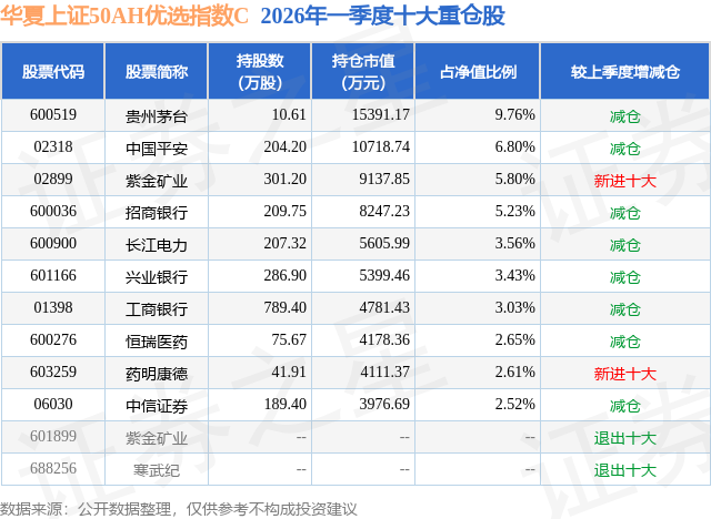 从基金规模来看,华夏上证50AH优选指数C基金2026年一季度公布的基金规模为0.33亿元,较上一期规模4314.36万元变化了-995.21万元,环比变化了-23.07%。该基金最新一期资产配置为:股票占净值比94.09%,债券占净值比1.29%,现金占净值比4.54%。从基金持仓来看,该基金当季前十大股票仓位达45.39%,第一大重仓股为贵州茅台(600519),持仓占比为9.76%。