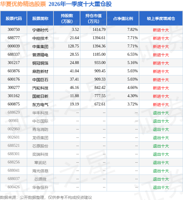 从基金规模来看,华夏优势精选股票基金2026年一季度公布的基金规模为1.81亿元,较上一期规模4.69亿元变化了-2.88亿元,环比变化了-61.39%。该基金最新一期资产配置为:股票占净值比82.14%,无债券类资产,现金占净值比18.51%。从基金持仓来看,该基金当季前十大股票仓位达57.69%,第一大重仓股为宁德时代(300750),持仓占比为7.82%。