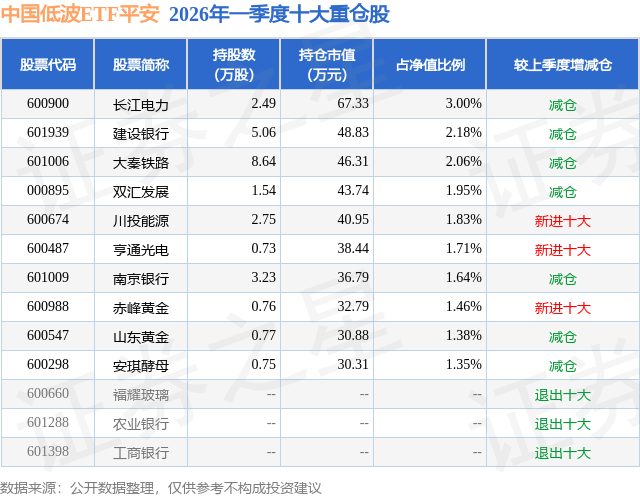 从基金规模来看,中国低波ETF平安基金2026年一季度公布的基金规模为0.22亿元,较上一期规模2.04亿元变化了-1.81亿元,环比变化了-88.99%。该基金最新一期资产配置为:股票占净值比96.37%,无债券类资产,现金占净值比4.17%。从基金持仓来看,该基金当季前十大股票仓位达18.56%,第一大重仓股为长江电力(600900),持仓占比为3.0%。