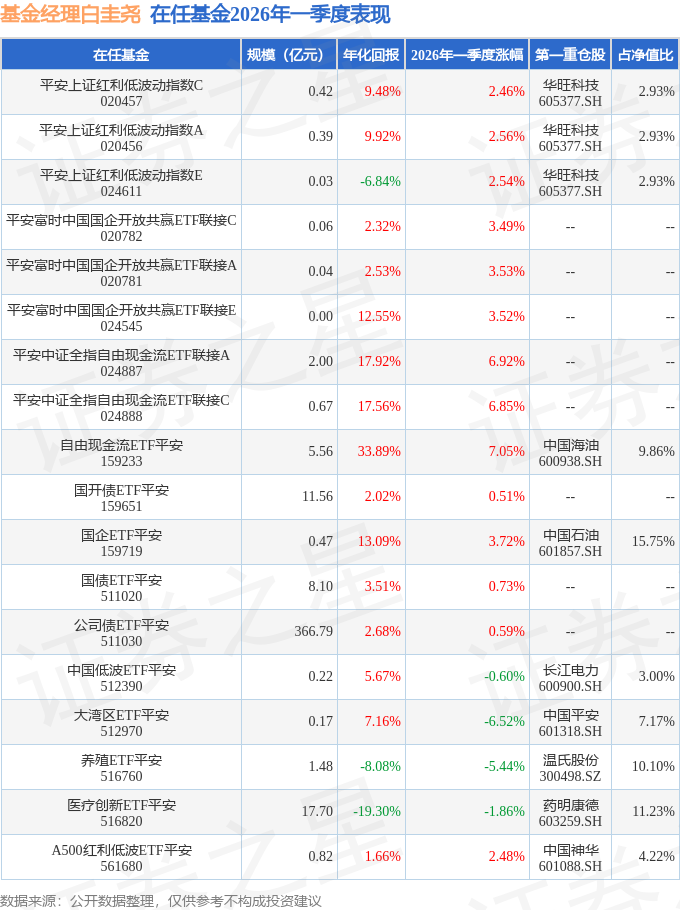 证券之星消息,日前中国低波ETF平安基金公布一季报,2026年一季度最新规模0.22亿元,季度净值涨幅为-0.6%。