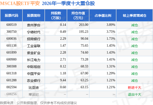 从基金规模来看,MSCIA股ETF平安基金2026年一季度公布的基金规模为0.52亿元,较上一期规模5951.81万元变化了-738.91万元,环比变化了-12.41%。该基金最新一期资产配置为:股票占净值比99.47%,债券占净值比0.05%,现金占净值比0.86%。从基金持仓来看,该基金当季前十大股票仓位达18.68%,第一大重仓股为贵州茅台(600519),持仓占比为3.89%。