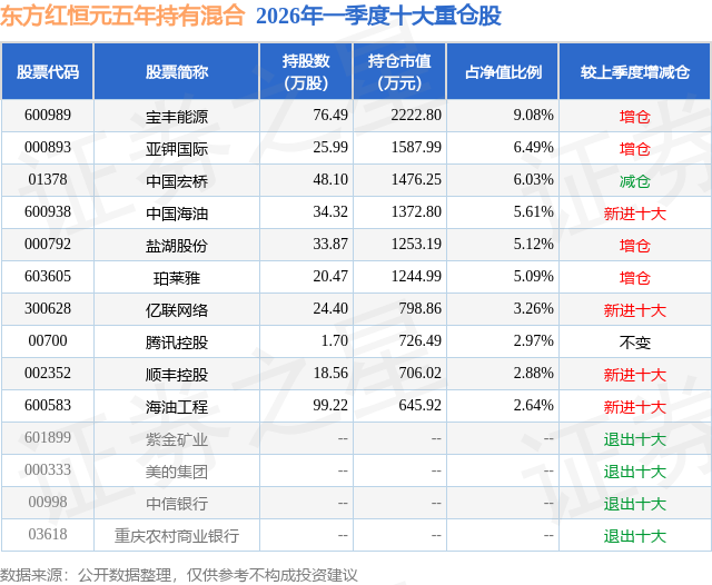 从基金规模来看,东方红恒元五年持有混合基金2026年一季度公布的基金规模为2.45亿元,较上一期规模4.11亿元变化了-1.67亿元,环比变化了-40.48%。该基金最新一期资产配置为:股票占净值比78.14%,无债券类资产,现金占净值比22.77%。从基金持仓来看,该基金当季前十大股票仓位达49.17%,第一大重仓股为宝丰能源(600989),持仓占比为9.08%。