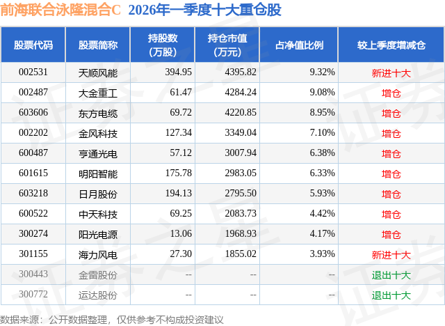 从基金规模来看,前海联合泳隆混合C基金2026年一季度公布的基金规模为4.14亿元,较上一期规模2.22亿元变化了1.92亿元,环比变化了86.72%。该基金最新一期资产配置为:股票占净值比93.09%,无债券类资产,现金占净值比15.52%。从基金持仓来看,该基金当季前十大股票仓位达65.61%,第一大重仓股为天顺风能(002531),持仓占比为9.32%。