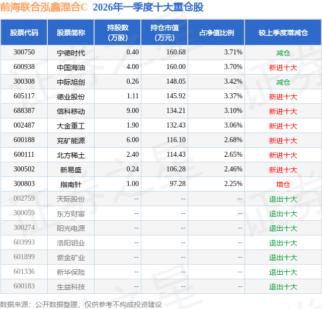 从基金规模来看,前海联合泓鑫混合C基金2026年一季度公布的基金规模为0.12亿元,较上一期规模1309.62万元变化了-62.21万元,环比变化了-4.75%。该基金最新一期资产配置为:股票占净值比82.25%,无债券类资产,现金占净值比18.08%。从基金持仓来看,该基金当季前十大股票仓位达30.4%,第一大重仓股为宁德时代(300750),持仓占比为3.71%。