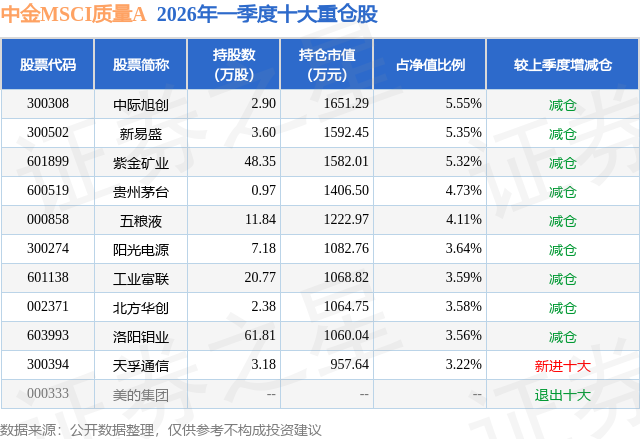 从基金规模来看,中金MSCI质量A基金2026年一季度公布的基金规模为2.43亿元,较上一期规模2.92亿元变化了-4910.42万元,环比变化了-16.79%。该基金最新一期资产配置为:股票占净值比94.85%,债券占净值比6.01%,现金占净值比1.38%。从基金持仓来看,该基金当季前十大股票仓位达42.65%,第一大重仓股为中际旭创(300308),持仓占比为5.55%。