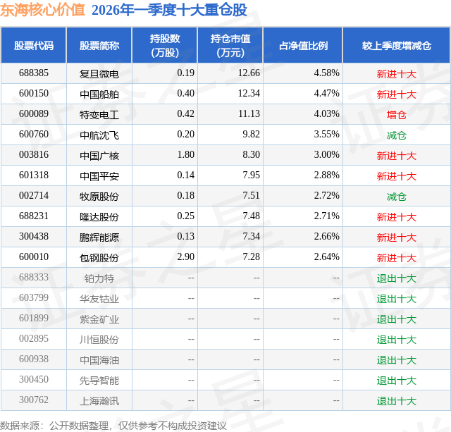 从基金规模来看,东海核心价值基金2026年一季度公布的基金规模为0.03亿元,较上一期规模343.34万元变化了-67.1万元,环比变化了-19.54%。该基金最新一期资产配置为:股票占净值比77.81%,无债券类资产,现金占净值比22.3%。从基金持仓来看,该基金当季前十大股票仓位达33.24%,第一大重仓股为复旦微电(688385),持仓占比为4.58%。