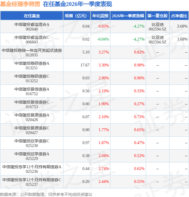 证券之星消息,日前中信建投睿溢混合C基金公布一季报,2026年一季度最新规模0.02亿元,季度净值涨幅为-4.27%。