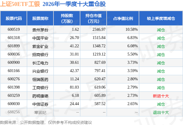 从基金规模来看,上证50ETF工银基金2026年一季度公布的基金规模为2.22亿元,较上一期规模3.75亿元变化了-1.54亿元,环比变化了-40.9%。该基金最新一期资产配置为:股票占净值比99.12%,无债券类资产,现金占净值比0.91%。从基金持仓来看,该基金当季前十大股票仓位达47.28%,第一大重仓股为贵州茅台(600519),持仓占比为10.58%。