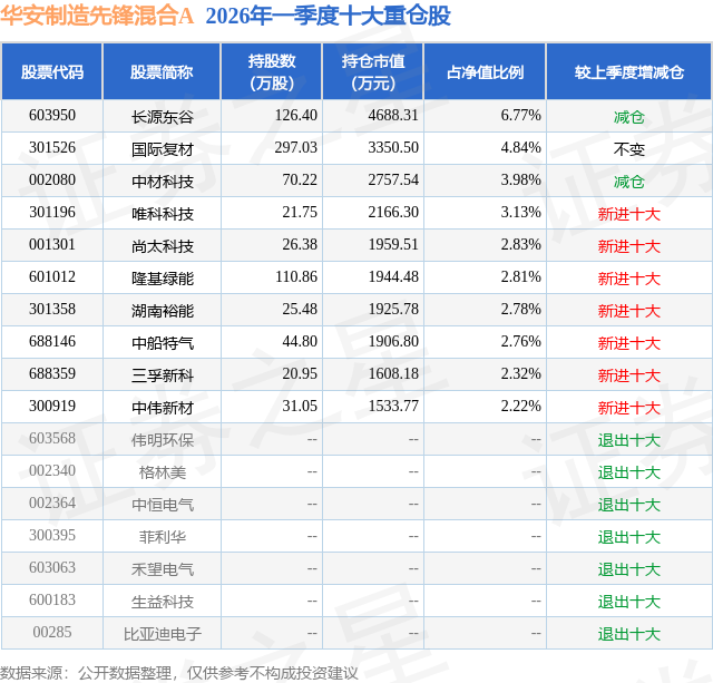 从基金规模来看,华安制造先锋混合A基金2026年一季度公布的基金规模为6.09亿元,较上一期规模4.09亿元变化了2.0亿元,环比变化了48.82%。该基金最新一期资产配置为:股票占净值比86.93%,债券占净值比0.47%,现金占净值比11.68%。从基金持仓来看,该基金当季前十大股票仓位达34.44%,第一大重仓股为长源东谷(603950),持仓占比为6.77%。