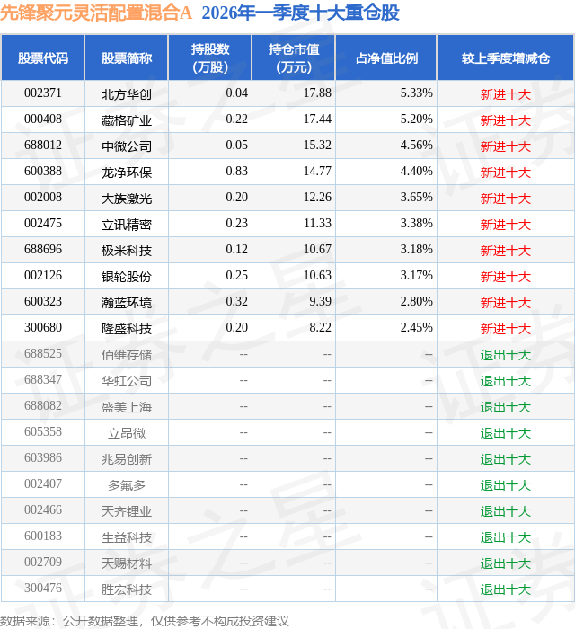 证券之星消息,日前先锋聚元灵活配置混合A基金公布一季报,2026年一季度最新规模0.01亿元,季度净值涨幅为-0.21%。