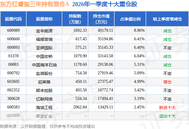 从基金规模来看,东方红睿玺三年持有混合A基金2026年一季度公布的基金规模为54.76亿元,较上一期规模68.28亿元变化了-13.52亿元,环比变化了-19.8%。该基金最新一期资产配置为:股票占净值比81.22%,无债券类资产,现金占净值比19.02%。从基金持仓来看,该基金当季前十大股票仓位达52.26%,第一大重仓股为宝丰能源(600989),持仓占比为8.96%。