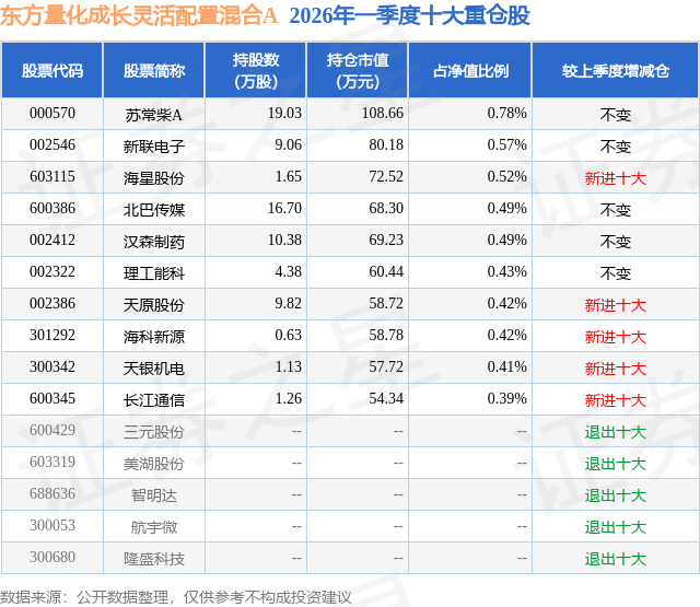 证券之星消息,日前东方量化成长灵活配置混合A基金公布一季报,2026年一季度最新规模1.28亿元,季度净值涨幅为3.12%。