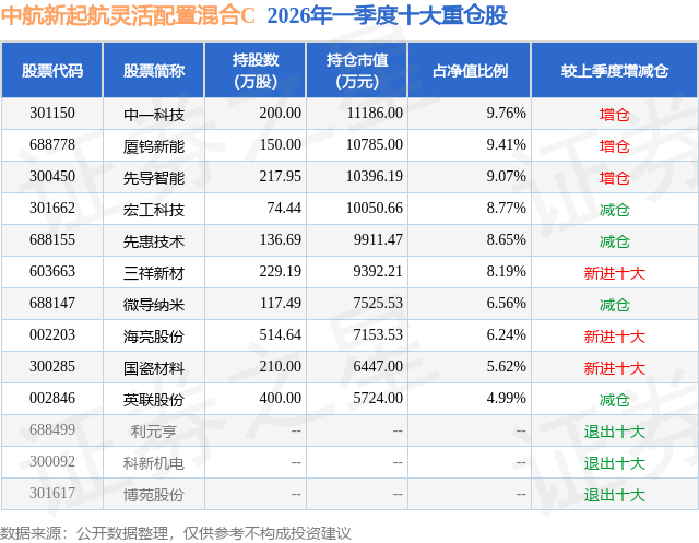 从基金规模来看,中航新起航灵活配置混合C基金2026年一季度公布的基金规模为10.56亿元,较上一期规模1.52亿元变化了9.04亿元,环比变化了595.98%。该基金最新一期资产配置为:股票占净值比92.47%,无债券类资产,现金占净值比7.61%。从基金持仓来看,该基金当季前十大股票仓位达77.26%,第一大重仓股为中一科技(301150),持仓占比为9.76%。