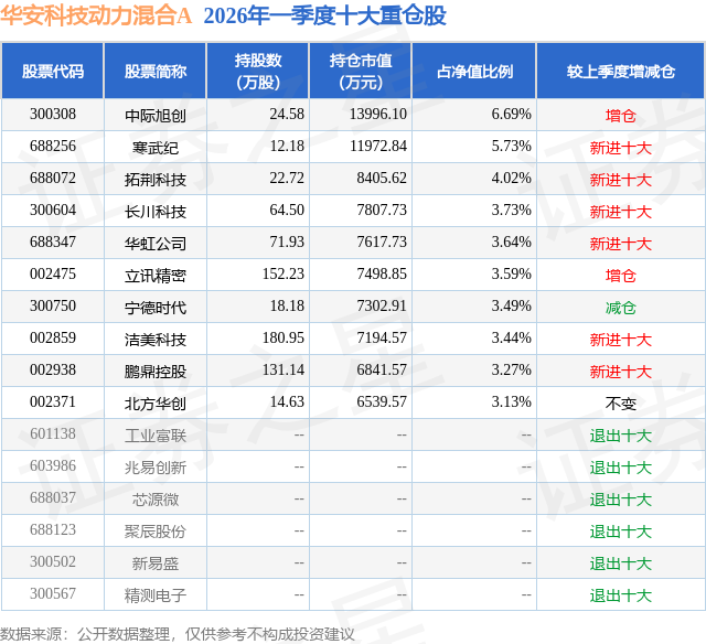 从基金规模来看,华安科技动力混合A基金2026年一季度公布的基金规模为19.16亿元,较上一期规模20.72亿元变化了-1.56亿元,环比变化了-7.52%。该基金最新一期资产配置为:股票占净值比87.05%,无债券类资产,现金占净值比14.39%。从基金持仓来看,该基金当季前十大股票仓位达40.73%,第一大重仓股为中际旭创(300308),持仓占比为6.69%。
